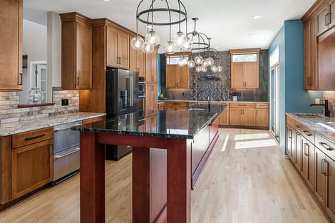 - Contrasting wood colors used in the kitchen cabinetry and the eat-in island area