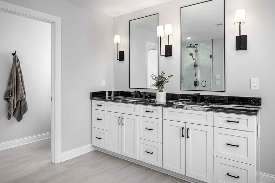 In the master bathroom, wall sconces replace traditional vanity lights. Most folks prefer a light cast in front rather than from above. The calculated spacing between the vanity lights and mirrors, paired with ample drawer storage, speaks to a meticulous design approach. Note the ample vanity storage and bold black touches for a space that speaks for itself. The stand-up shower houses one of our favorite design elements: a showerhead mounted outside the tile, revealing its mechanics. It’s an artistic blend of industrial and contemporary aesthetics that shows the love and care we pour into every element and decision.